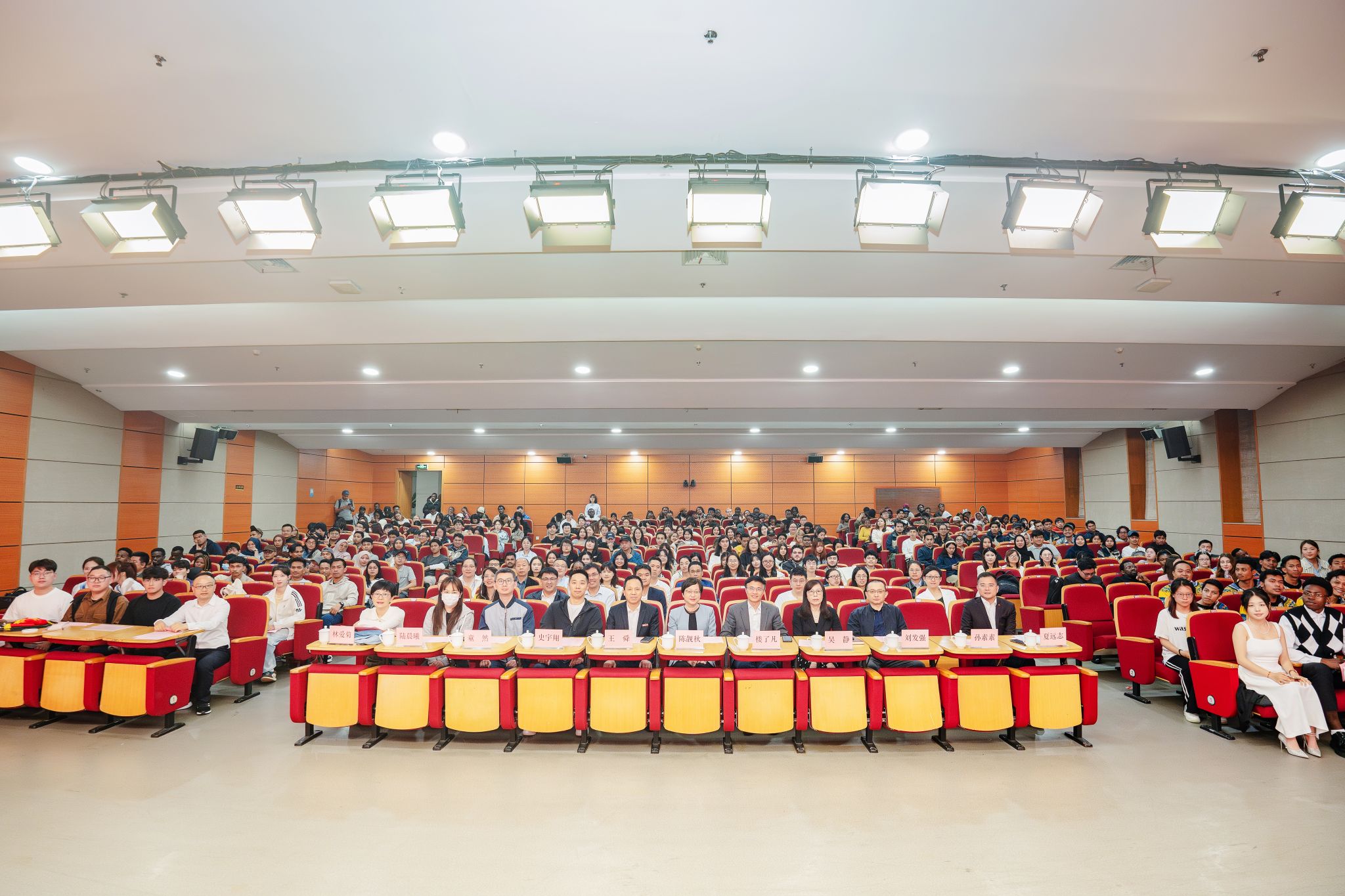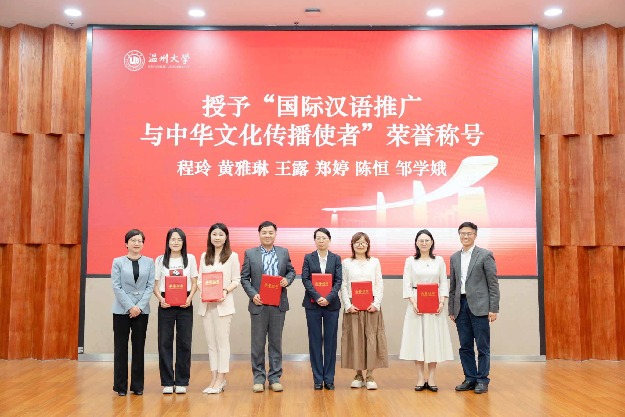 荣誉授予环节,温州市委宣传部、市外办领导为长期致力于国际中文教育事业的教师代表颁发“国际汉语推广与中华文化传播使者”荣誉称号,表彰他们在促进中外文化交流中作出的突出贡献。随着全体领导共同按下启动装置,“国际化街区建设公益汉语文化系列讲堂”正式拉开帷幕,该项目将通过定期举办公益语言课程和文化活动,为在温外籍人士提供更优质的中文学习服务。在热烈的掌声中,王舜宣布:“温州大学首届国际中文嘉年华系列活动正式开幕!”这一刻,全场响起经久不息的掌声,象征着这场文化盛宴的华彩启程。
