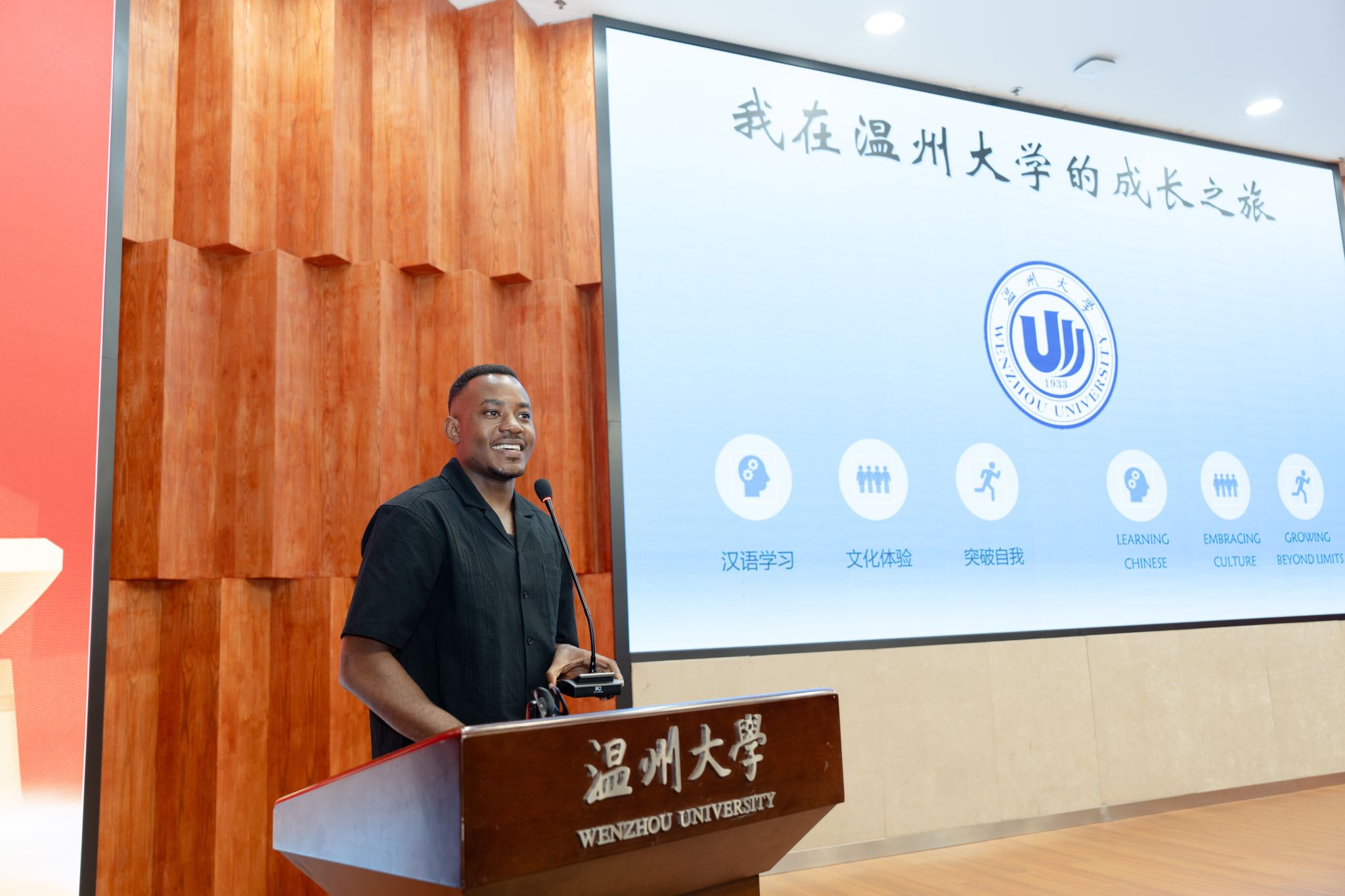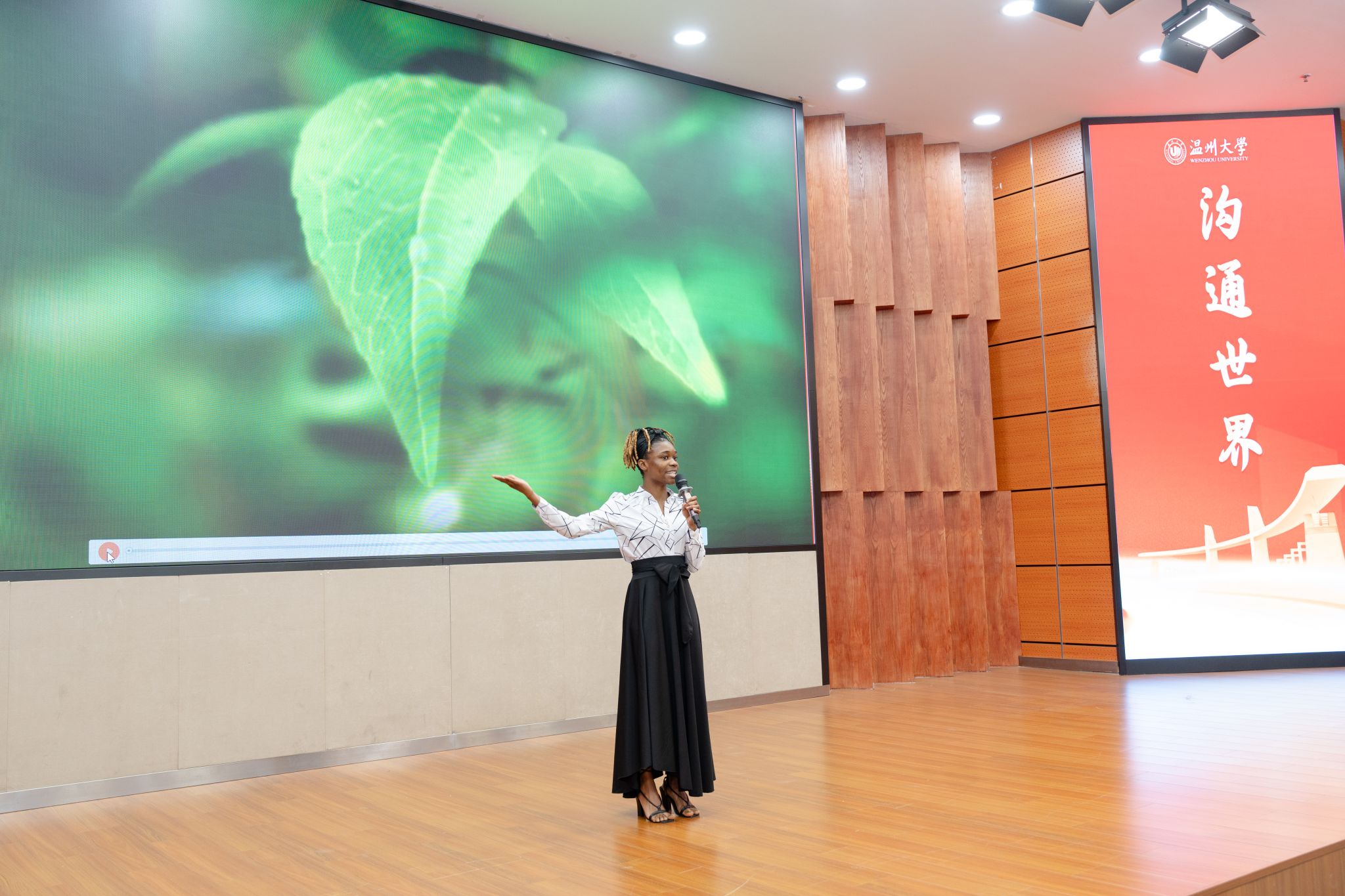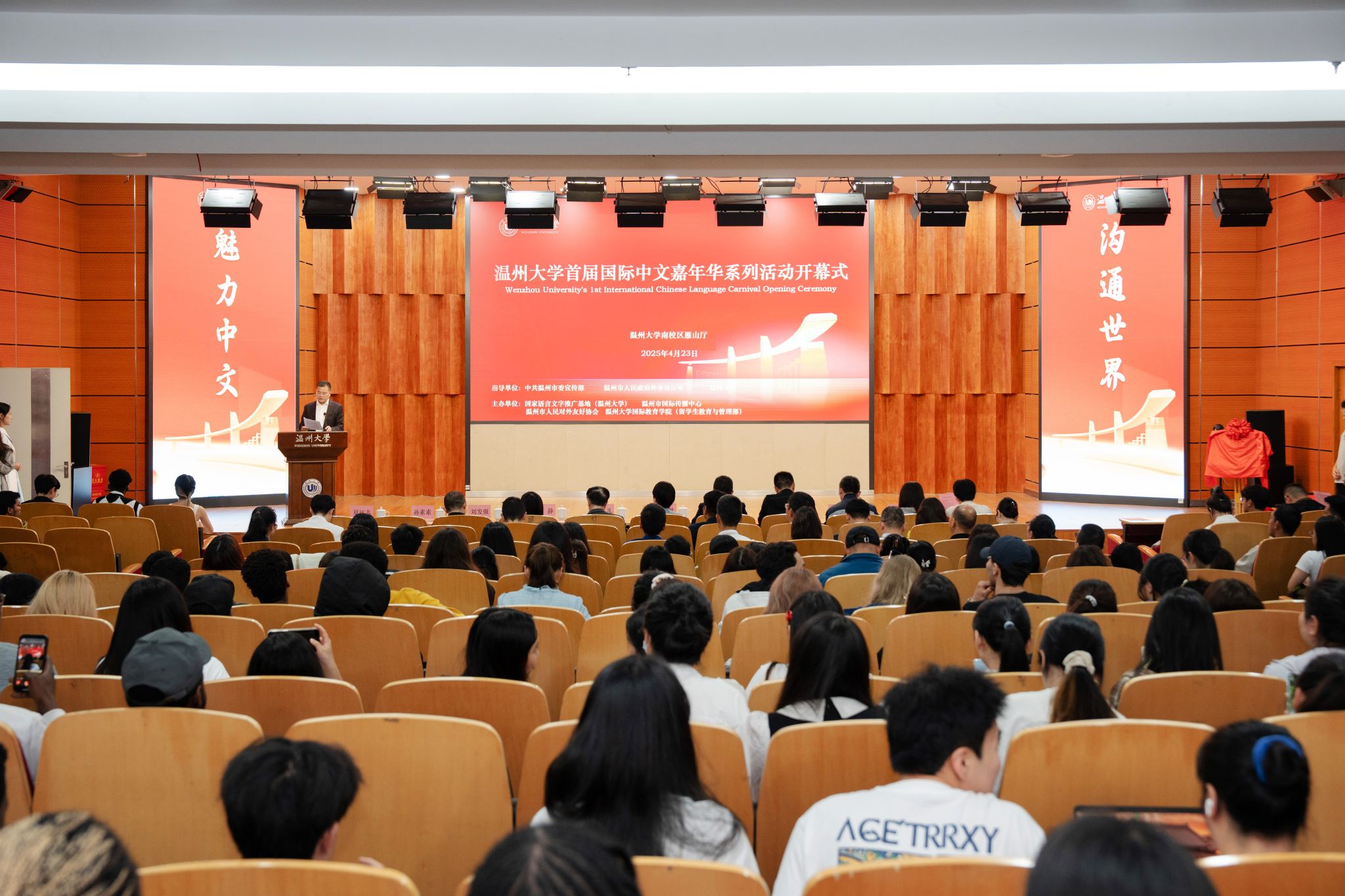 (留学生教育与管理部)联合国家语言文字推广基地(温州大学)、温州市国际传播中心、温州市人民对外友好协会共同主办。温州市委宣传部副部长陈靓秋,温州市人民政府外事办公室副主任楼了凡,温州大学党委委员、副校长王舜,温州大学党委委员、宣传部长吴静,温州市国际传播中心、温州市人民对外友好协会相关负责人、温州大学相关部门及学院负责人出席开幕式,与来自世界各地的留学生、师生代表及各界嘉宾汇聚一堂,以语言为媒、以文化为桥,开启了一场跨越国界、共话文明的交流盛会。
