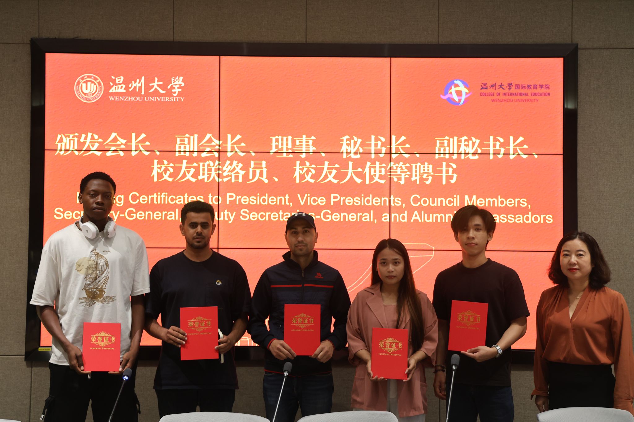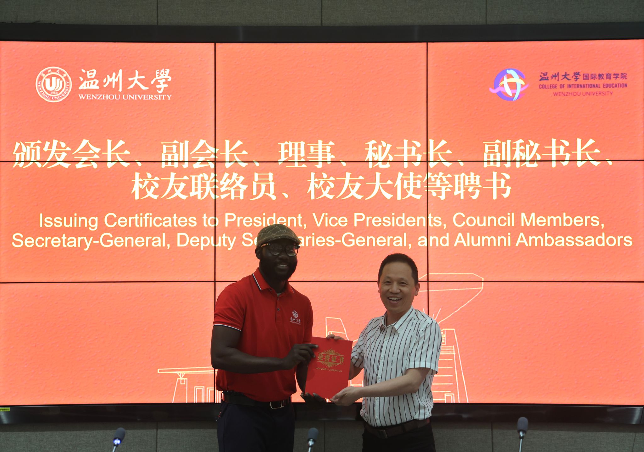 聘书颁发仪式上,副校长王舜为加纳籍校友、新当选会长ADOFO MICHAEL ADJEI颁发聘书,陈宏毅主任、林爱菊书记分别为校友会第一届理事、新一届校友联络员颁发聘书。会长ADOFO MICHAEL ADJEI在温州工作多年,作为优秀校友之一,他表示:“非常感谢学校的培养与厚爱,自己当选会长倍感责任重大,将发挥自己的力量为母校校友工作发展添砖加瓦,也将继续为学弟学妹提供帮助。”