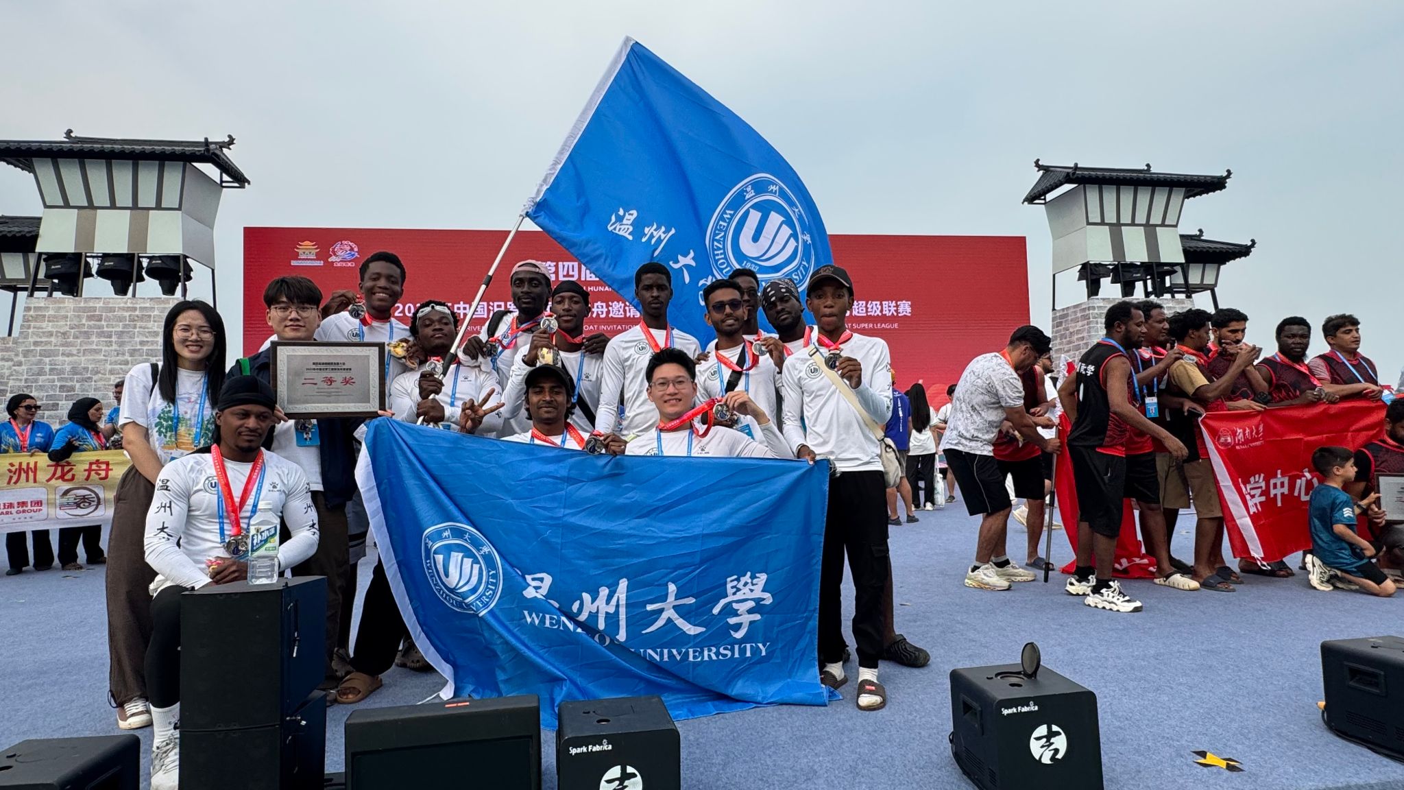 5月24日,成人影视国际龙舟队应邀赴湖南汨罗参加2025年中国汨罗江国际龙舟邀请赛暨“屈原酒”杯第二届龙舟超级联赛。来自越南、孟加拉、摩洛哥、尼日利亚、利比里亚、赞比亚、津巴布韦、索马里等国的留学生代表校国际龙舟队与日本、韩国、新西兰、同济大学、北京理工大学、中南大学等12支国际组龙舟队展开激烈角逐,他们以昂扬的斗志和非凡的团结精神勇夺国际组二等奖、高校组第二名的好成绩。