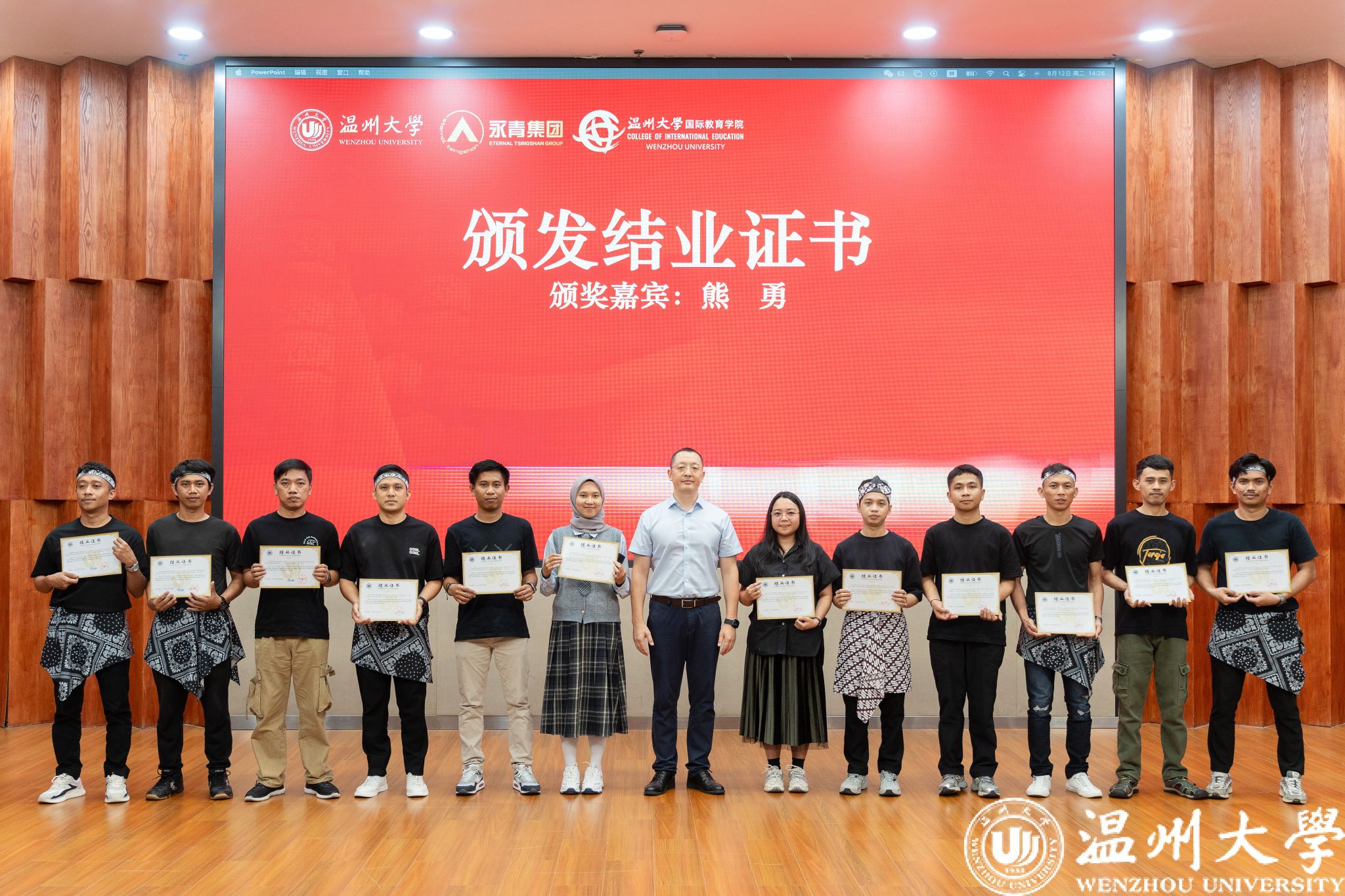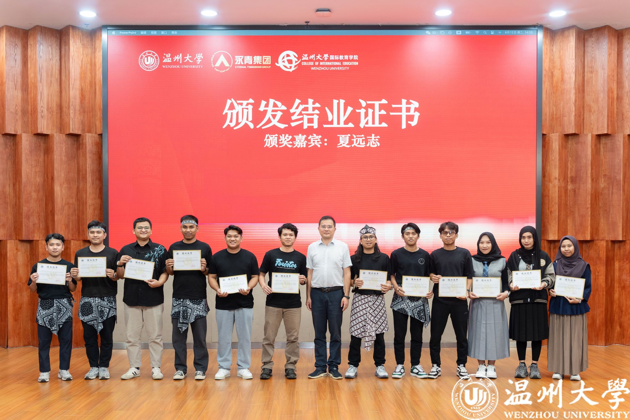 活动在全体师生合影中圆满落幕。学员们身着传统服饰,与领导、老师共同定格这一珍贵瞬间。结业不是终点,而是新的起点。未来,青山班学员将带着在温大的收获,成为中印尼经贸合作与文化交流的使者,续写更多精彩故事。