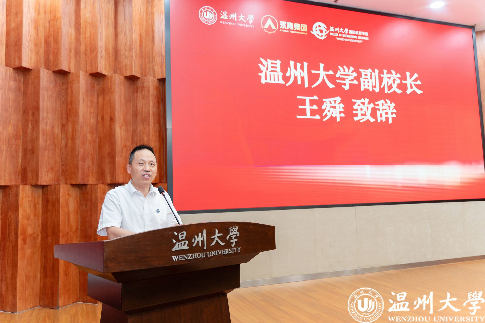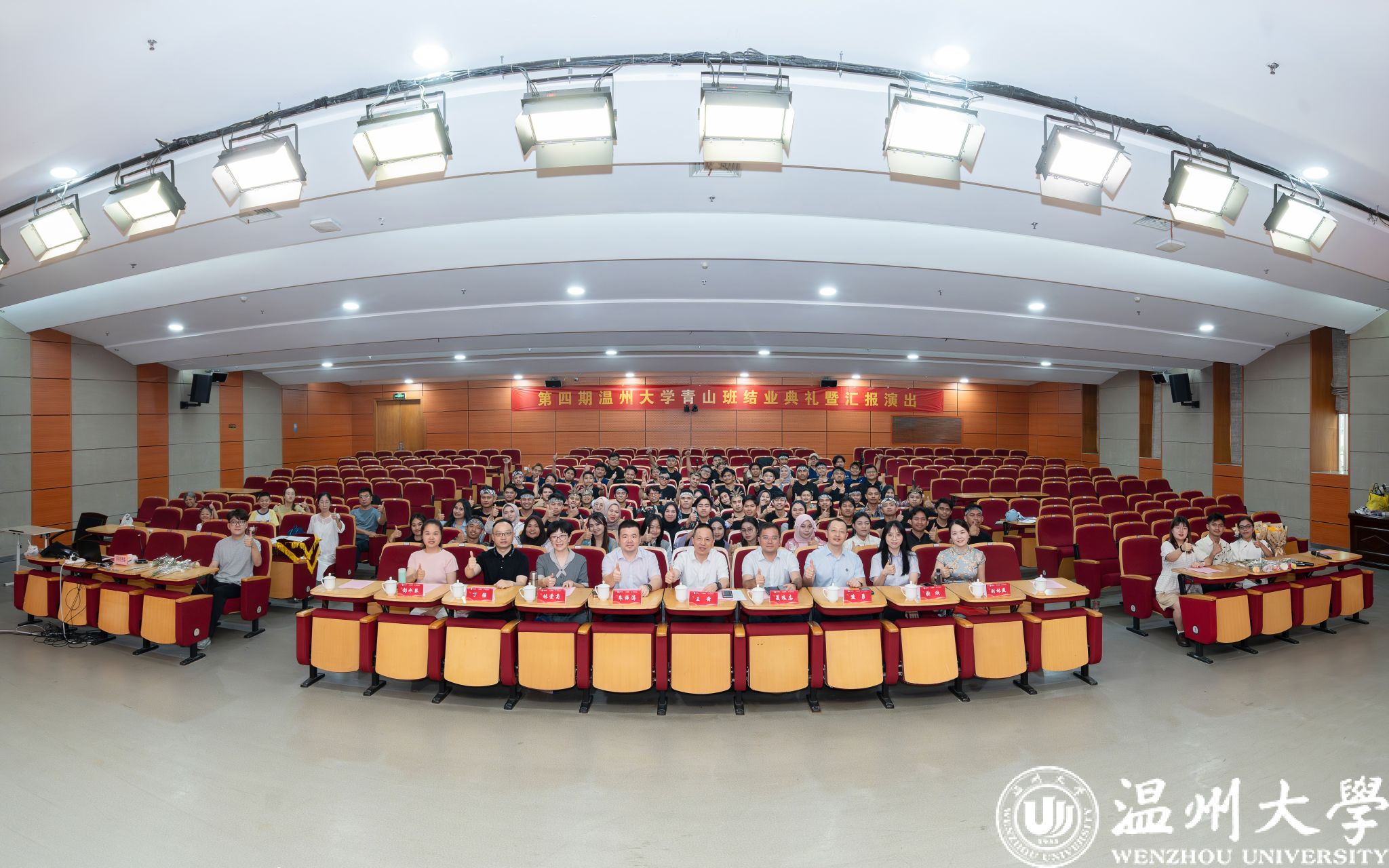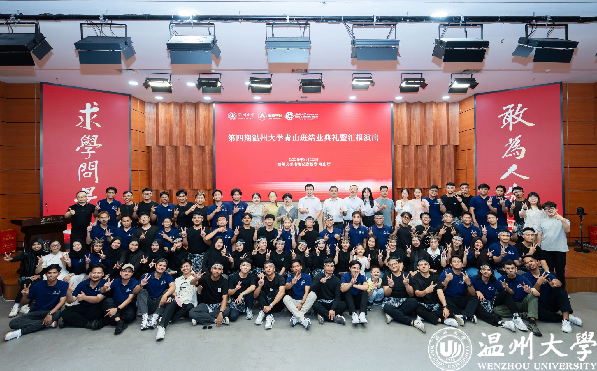 2025年8月12日下午,温州大学南校区岩松堂雁山厅内洋溢着热情与感动,第四期温州大学青山班结业典礼暨汇报演出在此举行。温州大学副校长王舜、青山实业永青集团代表朱振涛、温州大学国际交流与合作处、成人影视