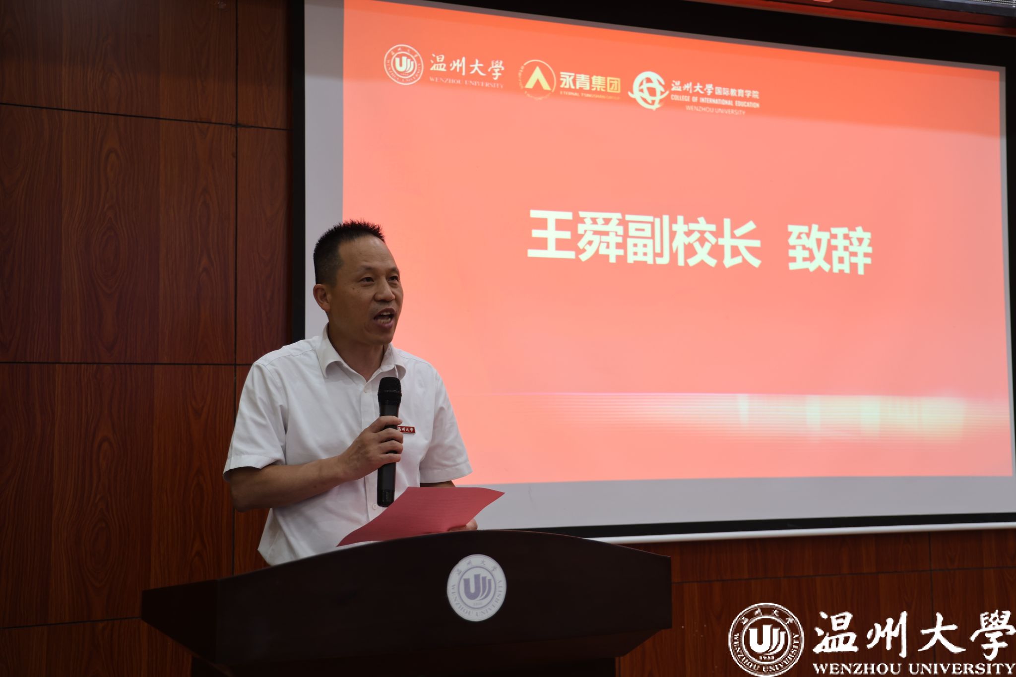 朱振涛副经理致辞。他感谢温州大学为青山班学员提供的优质教育平台,并祝贺学员们开启宝贵的留学之旅,并勉励大家珍惜难得的学习机会,尽快适应新环境、融入新生活,主动了解中国文化、青山实业及温州本地的历史与发展。他还特别叮嘱大家增强安全意识,做到结伴出行、集体活动提前报备,祝愿大家学有所成、平安健康。