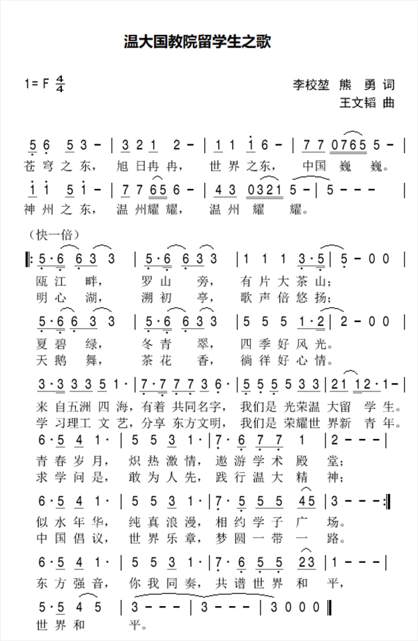 作词、音乐学院作曲联合制作的《温大国教院留学生之歌》今日首发。经查实,国内其他高校尚无专门的留学生歌曲,此歌也因此成为国内首创的高校留学生主题原创歌曲。