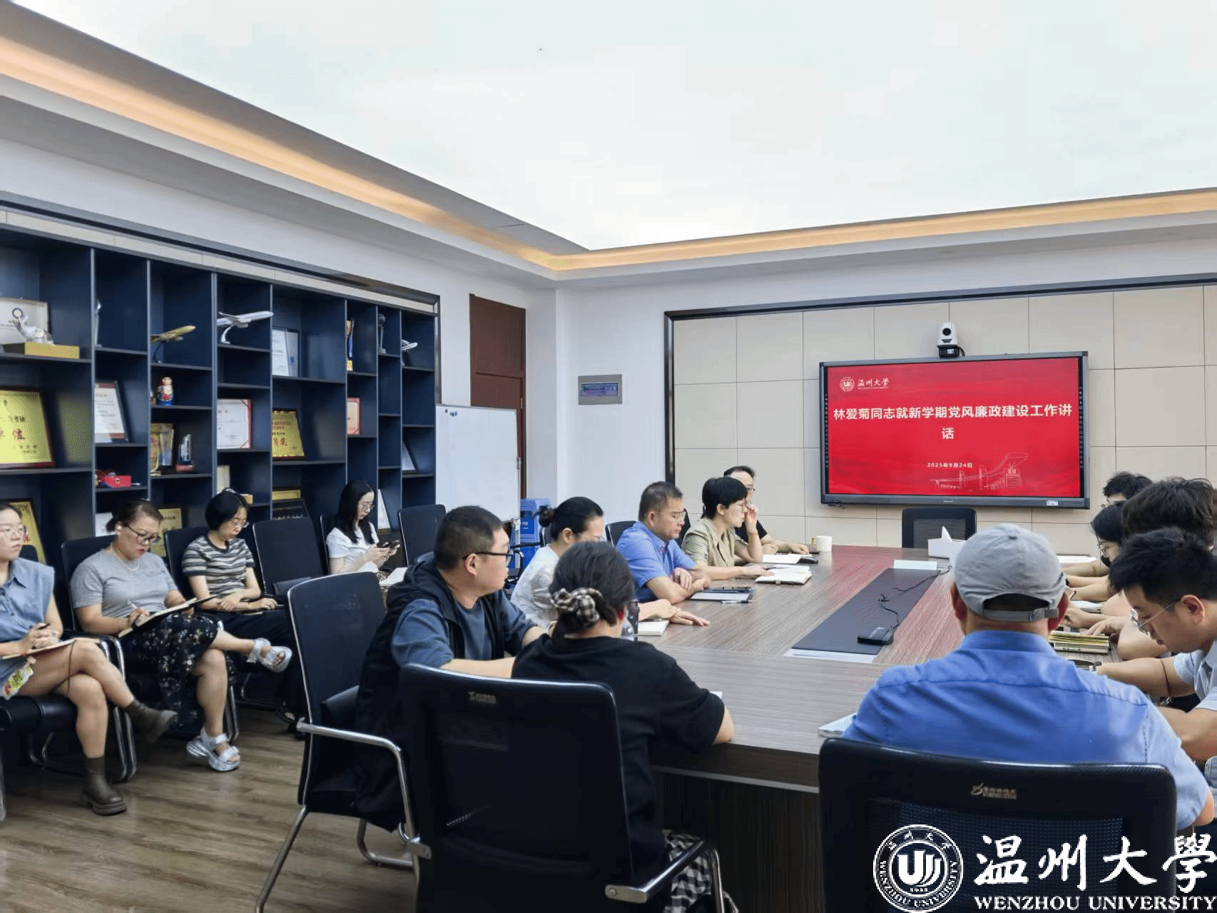 以理论武装筑牢思想堡垒。 会议伊始,支部书记丁强同志领学了《温州大学教职工处分规定(2025年修订)》,引导全体教工党员率先垂范,严守纪律红线,在师德师风建设中树立标杆。随后,学院党总支书记林爱菊同志领学了《习近平总书记关于统计工作重要讲话和重要指示批示精神》,强调党员同志在工作中要坚持实事求是、求真务实的作风,在数据统计等基础工作中体现党员的先进性与责任感。