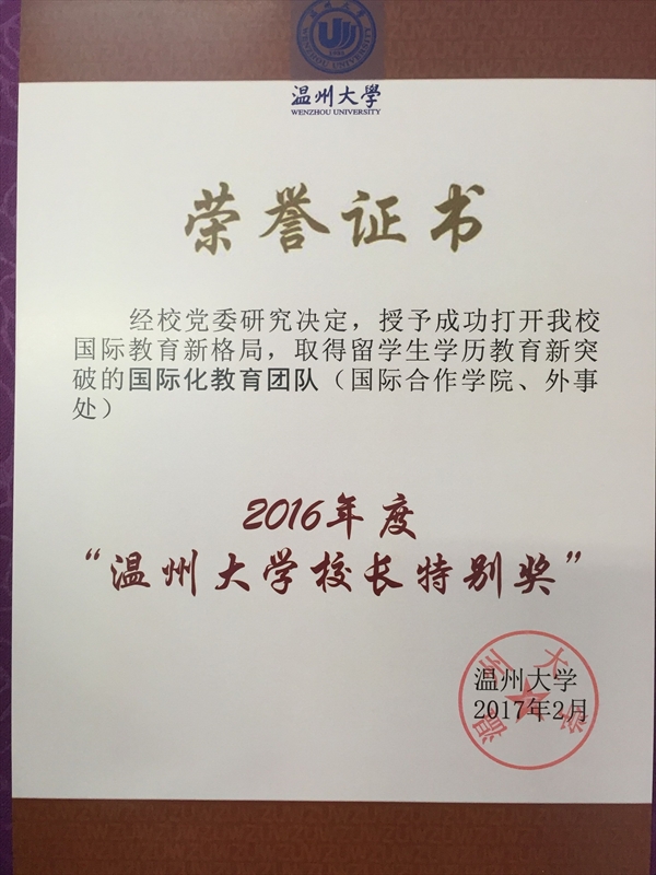 2017年2月19日,在茶山育英大礼堂召开了温州大学新学期全校教职工大会。会上,学校授予成功打开成人影视国际教育新格局,取得留学生学历教育新突破的国际化教育团队——国际合作学院和外事处“温州大学2016年度‘温州大学校长特别奖’”。