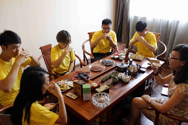 与教室里的热闹不同,在古色古香的茶室里一片宁静祥和,包含丽老师为营员们带来自己珍藏已久的茶。温壶,汤杯,装茶……包老师一边泡茶,一边给营员们介绍茶的种类,讲解茶道。喝之前必须先闻香,再品茗,这样才能真正感受到一杯好茶的韵味。一杯香茗入怀,心情也随之平静,心与心之间的距离似乎靠的更近。