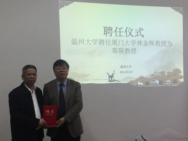 李校堃对我院中外合作办学工作表示肯定,并强调国际化是温州大学的重要发展战略,作为温州大学国际化发展的中坚力量的国际合作学院要继续发挥排头兵的作用。最后,举行了聘任仪式,李校堃亲自为林金辉教授颁发温州大学客座教授证书,正式聘请林金辉指导温州大学的中外合作办学,加快实现温州大学的国际化大发展。