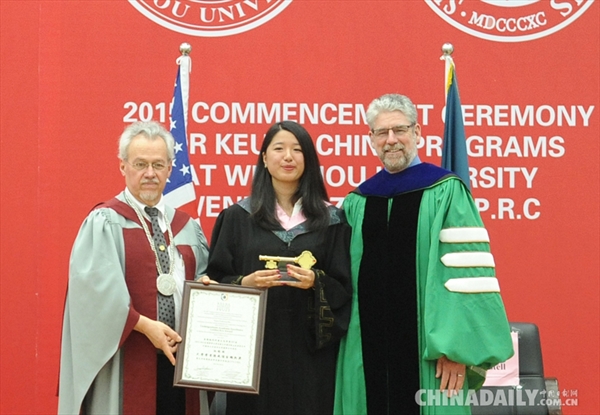 首届华裔双学位班是温州大学专门针对海外温州“侨后代”开设的中美双学位班,日前,双学位班首届学生顺利毕业,其中优秀学生代表意大利籍华裔学生胡瑜瑜以优异成绩,在美国纽约州库克大学与中国合作办学的4校5院707名学生中脱颖而出,以学业总成绩第一名的成绩获得库克大学的金钥匙奖。