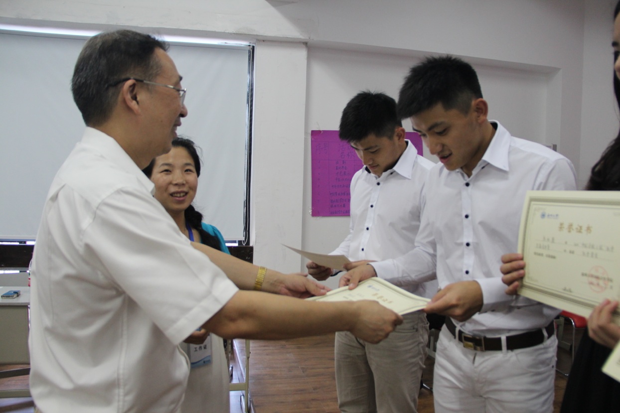 在结束闭营辞后,严院长为本次夏令营表现优异的营员颁奖。来自意大利的陈梦倩等11位营员获得了“青年营积极参与奖”。来自马来西亚的李汉斌,来自美国的陈秋霞,来自葡萄牙的周文渊、周保罗兄弟,来自意大利的陈梓航荣获了“青年营优秀营员”,表彰他们在夏令营全程无私地帮助指导教师,服务营员;表彰他们积极地组织和参与活动。除以上两个奖项之外,另设单项奖,表彰在某个方面特别突出的营员。来自西班牙的张鑫和来自法国的黄梨娜以他们的活泼热情赢得“最佳活力奖”;来自西班牙的张晓莉以她的好人缘无愧于“最佳人气奖”;来自美国的营员,同时也是本届和上届夏令营营长的王品淼当仁不让地夺得“最佳领导力奖”。除了颁发个人奖项,闭营仪式上还颁发了“最佳团体奖”。在历经出勤考核、“歌王歌后”争霸赛、中华文化知识竞赛、“中国梦故乡情”征文比赛等种种严苛而公平的竞争后,D组从四个组中脱颖而出,6位营员分享了“最佳团体奖”和500元现金大奖。此外,仪式还颁发营长、副营长和组长的任职证明以及征文比赛一二三和优秀奖。在征文比赛中,周保罗问鼎一等奖,得到300元现金鼓励;陈秋霞、周文渊夺得二等奖,分别获得200元奖励;王品淼等四位营员各得到100元作为三等奖奖金。本次夏令营的各项比赛均颁发证书并给予物质奖励,共计发出1900元,该举措旨在激励全体营员发挥积极性,热情参与各项活动。