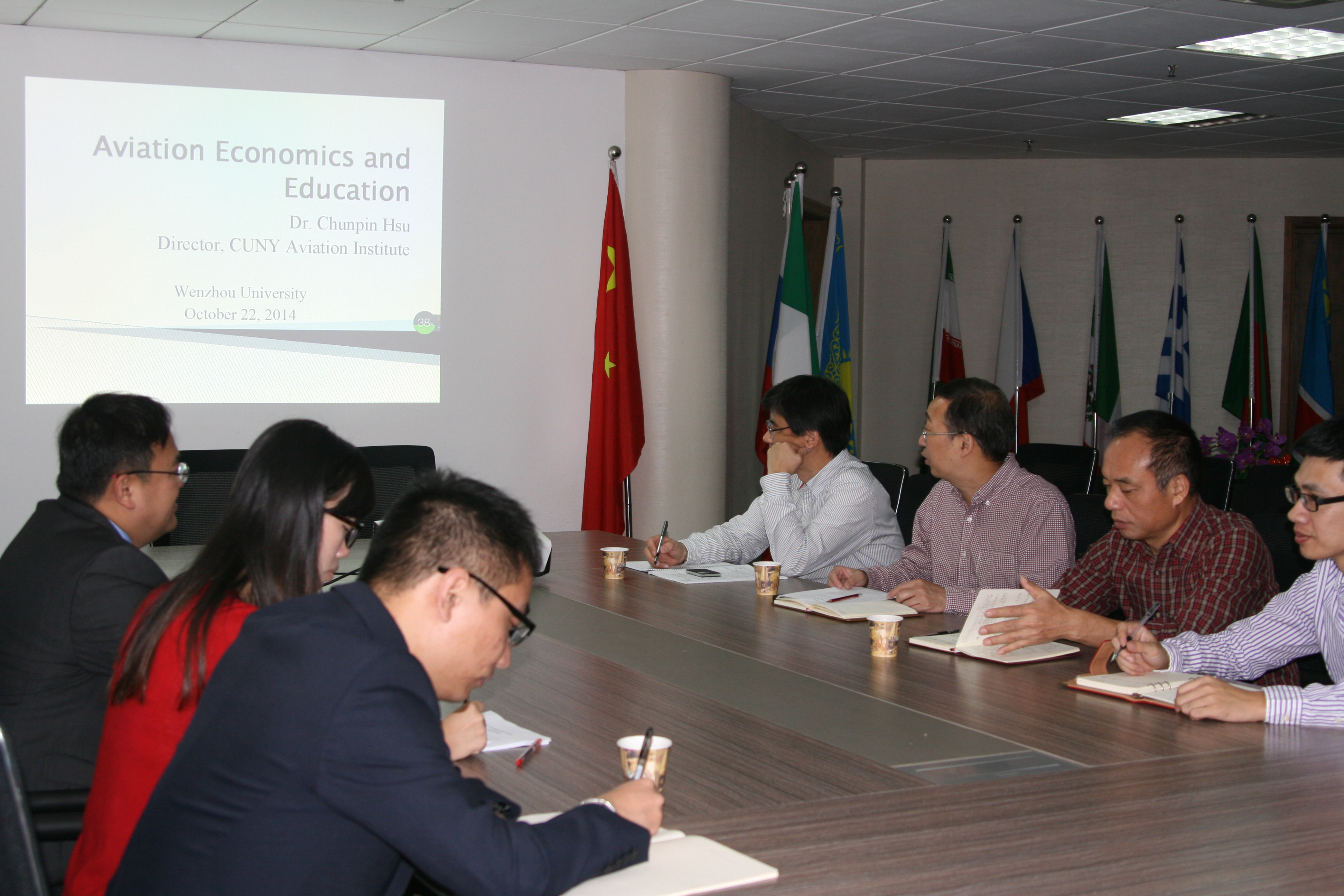 会后,许博士代表美国纽约城市大学约克学院航空中心与温州大学合作办学等事宜进行洽谈,就开展航空飞行员培养、航空管理专业合作办学等事宜达成了初步意向。