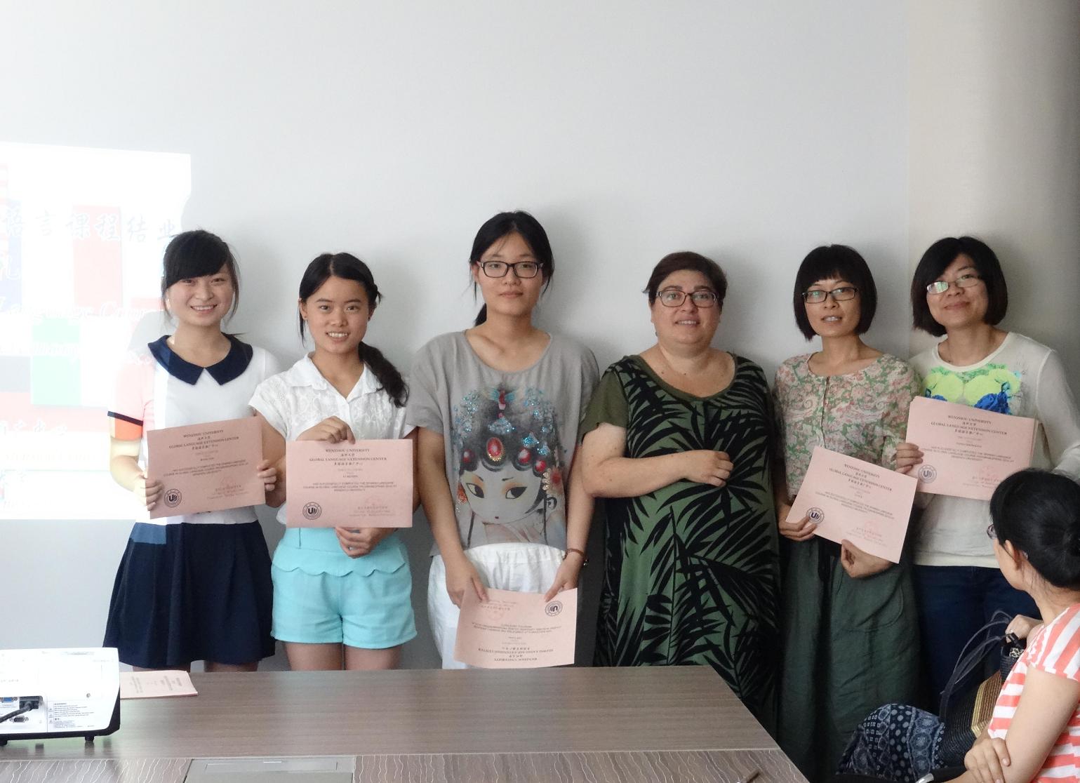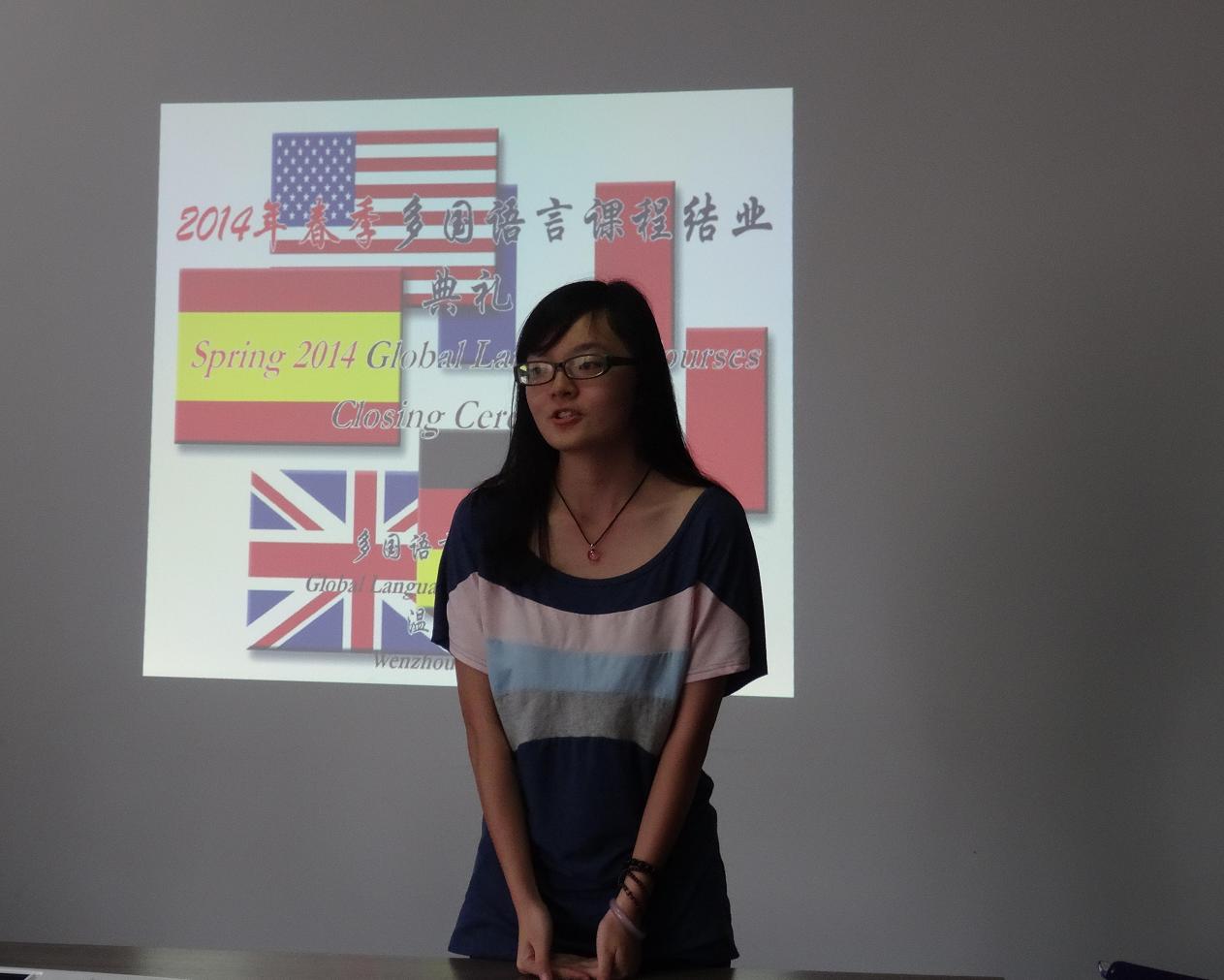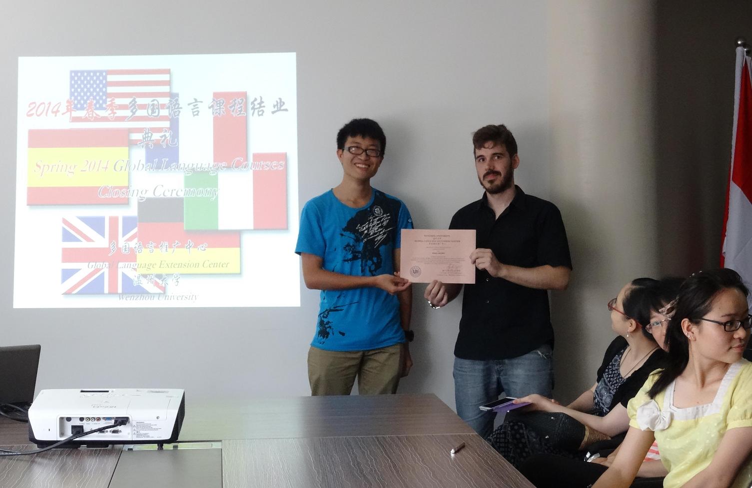 6月9日下午,温州大学多国语言推广中心在国际合作学院专家楼会议室举行了2014年春季多国语言课程结业典礼。本次典礼旨在让参与课程师生们了解课程的运行,并为授课老师及优秀学员颁发证书。