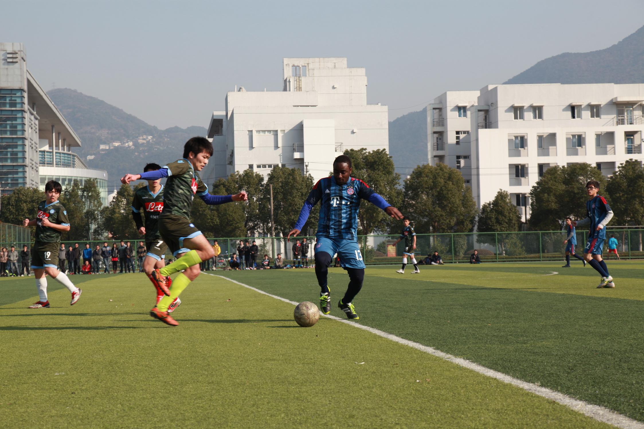 温州大学2013年“金秋杯”足球赛决赛于12月末在北校区足球场举行。比赛在国际合作学院与瓯江学院之间展开,两院队伍都是经过激烈角逐挺进决赛。国际合作学院的“联合国足球队”由中国、泰国、尼日利亚、加纳等国家学生组成,赛场旁围满了前来观战的球迷,全场热情高涨。