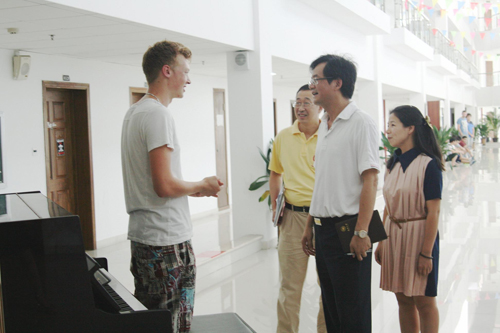 图为蔡校长亲切询问留学生在成人影视的学习、生活情况