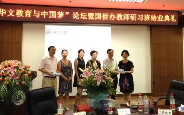 论坛结束后,与会领导还为参加2013年“华文教育•教师研习”欧美班的学员们颁发了结业证书和纪念品。据悉,本次培训班由国务院侨办主办,浙江省侨办、温州市侨办协办,温州大学承办,共有来自11个国家的35名华文教师在温州接受以小学课堂教学技能训练为重点的系统培训。