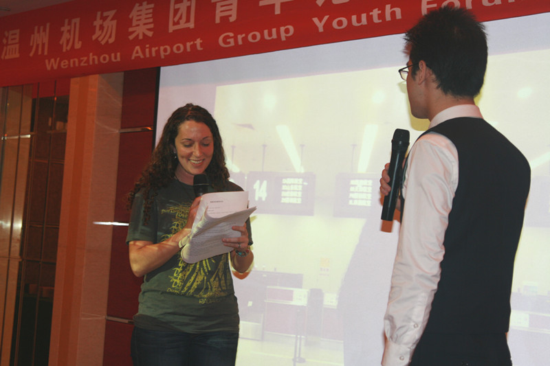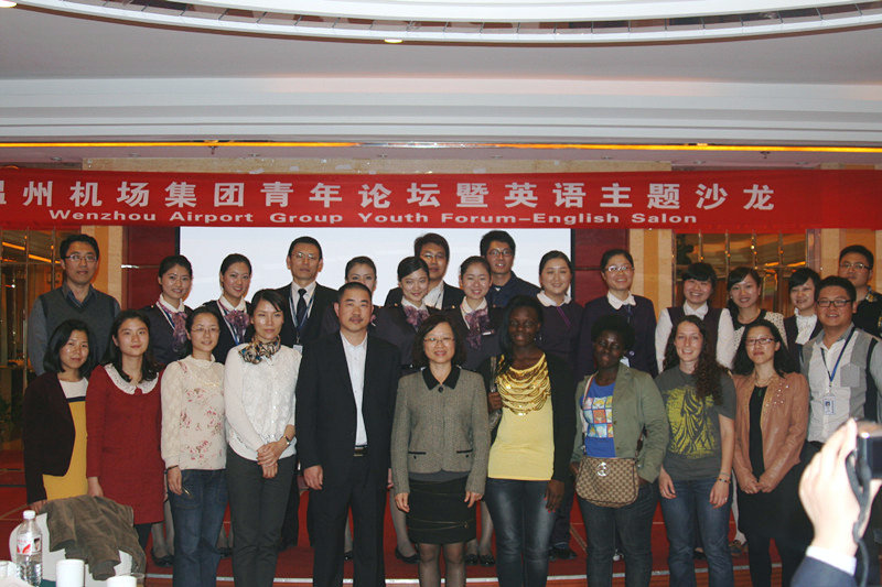 2012年11月13日,温州机场集团青年论坛暨英语主题沙龙活动在温州机场会议厅举行,我院美国留学生Alison,坦桑尼亚留学生Jacob,加纳留学生Akosua应邀参加,参加沙龙的还有外国语学院朱晓申副院长。