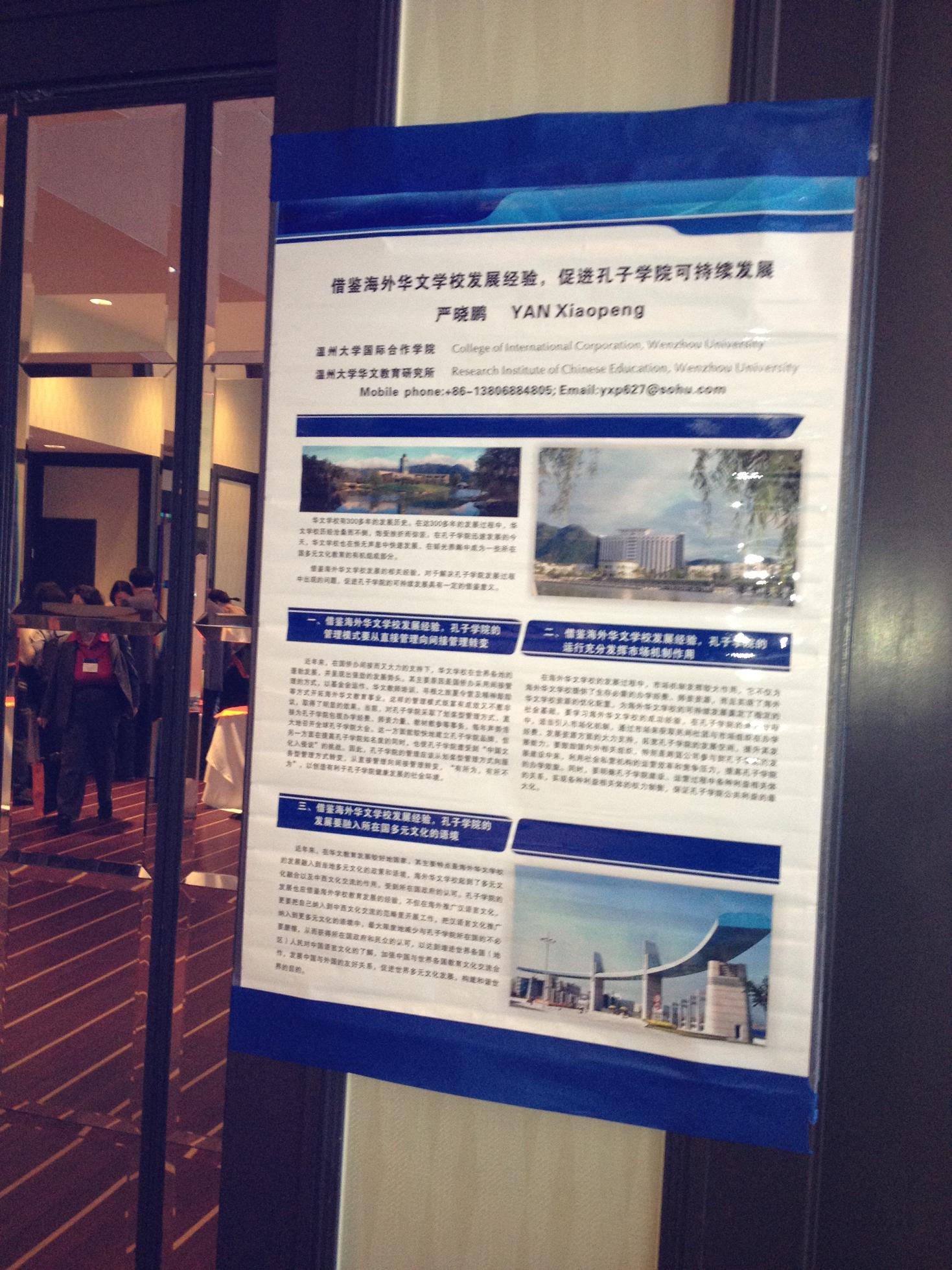 应CLEF(CHINESE LANGUAGE EDUCATION FORUM)邀请,我院严晓鹏院长于2012年11月10日至11日在美国旧金山市参加了第三届中文教学论坛。该论坛立足美西,面向全美和世界,旨在为不同国家、不同地区的中文教师和学者提供一个分享学术成果、交流工作经验、研讨中文教育当前面临的问题及发展方向的开放性国际平台。本届论坛有来自12个国家和地区的300多位学者参加,共收到有关学术论文近200篇。严院长的论文《借鉴海外华文学校发展经验,促进孔子学院可持续发展》被评为优秀论文,以海报形式进行了展示交流,受到了与会者的普遍好评。