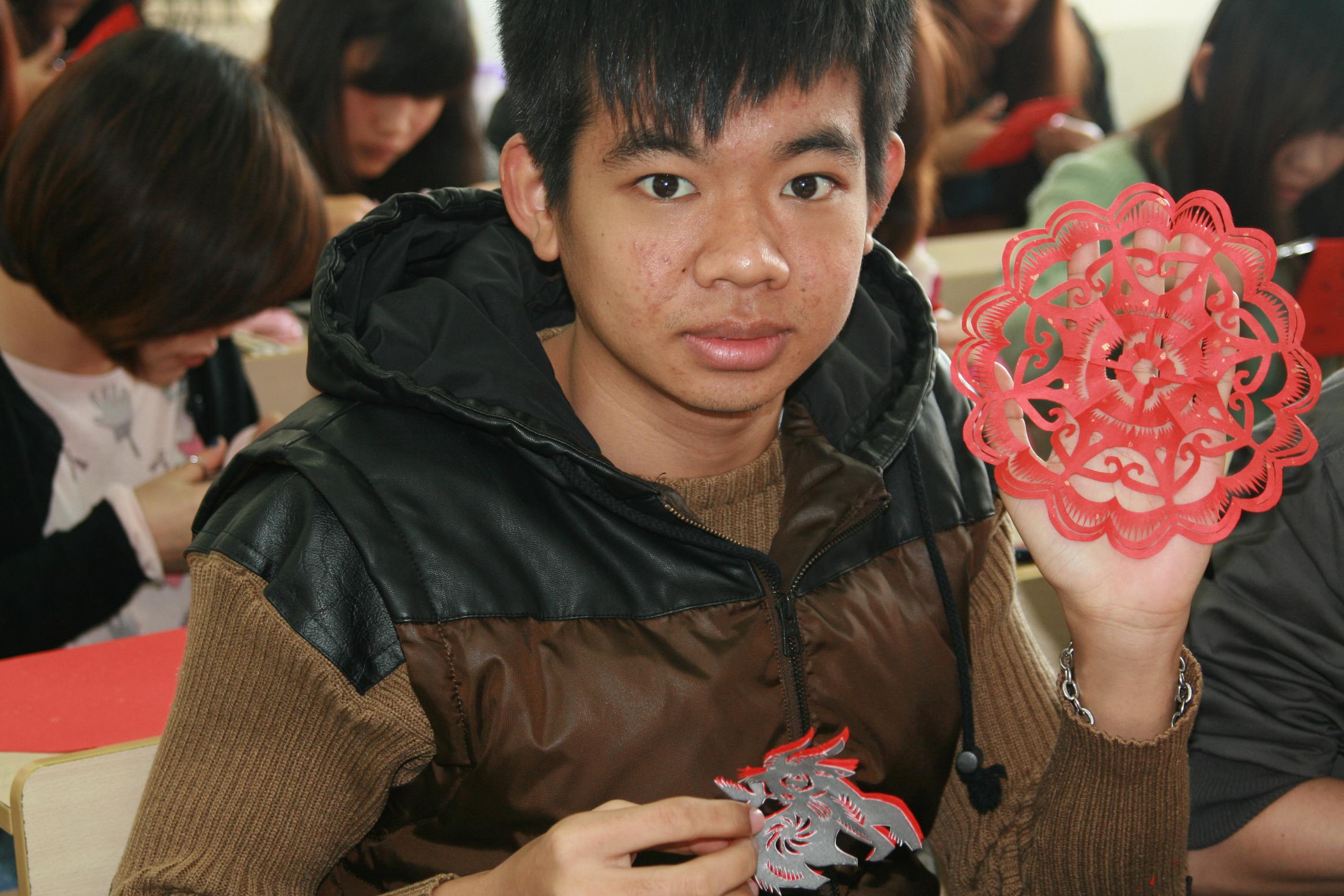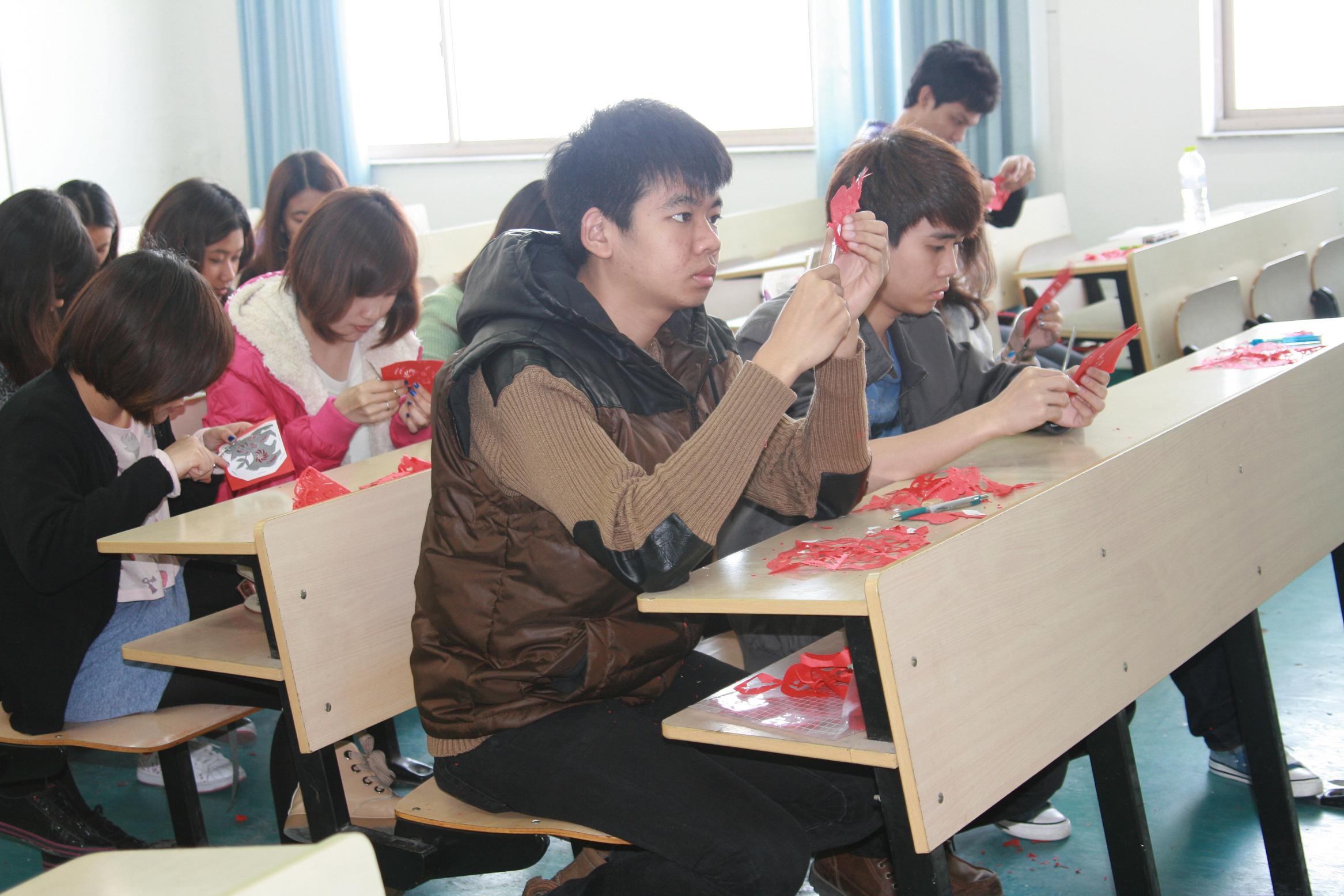 为了让泰国留学新生亲身体验中国剪纸艺术,我院特邀赖施虬老师给留学生讲授中国剪纸艺术。本学期,我们设置了6次课让留学生体验中国剪纸艺术。课堂上,赖施虬老师向留学生展示了不同流派和风格的剪纸作品,一幅幅精美的剪纸图画立刻吸引了留学生们的目光。在赖老师的带领下,同学们饶有兴致地拿起剪刀学起中国剪纸来。两个多小时的剪纸课里,同学们或模仿或发挥,看着自己努力之后的作品欣喜不已。剪纸课结束时,很多同学仍意犹未尽。
