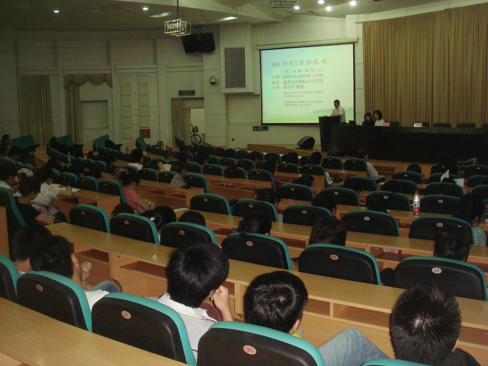 2010年6月28日晚7点,我院特别邀请了美国哈佛大学教育研究学院博士后、美国纽约州库克大学副校长兼库克中国项目负责人黄天中教授博士在学院路校区信息楼报告厅为广大的温州考生作“关于如何规划快乐生涯”的讲座。