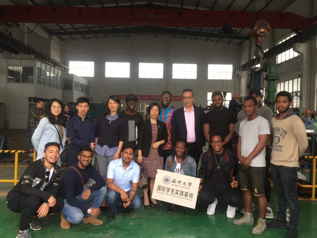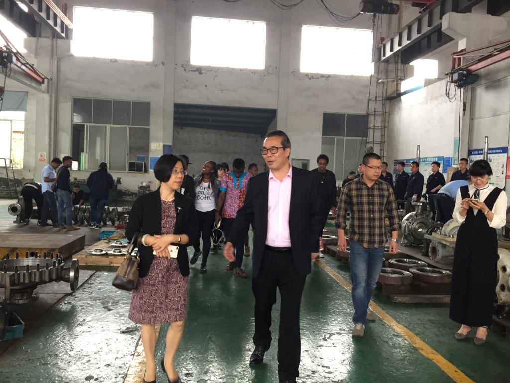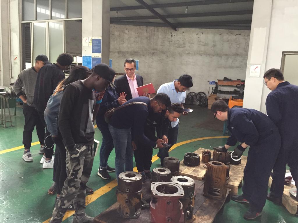 李作俊带领学院师生一行参观了工厂车间,并一一介绍了泵的铸造、加工及装配等工序。学生们兴致盎然、细心参观。机械工程专业的学生们认真观察、仔细研究了泵芯安装和不同成品,将所学专业知识联系到实践中,不时地向在场师傅提问。来自几内亚的GUILAVOGUI ELIE AKOYE甚至直接上手跟师傅学做零部件,体验泵的制造工艺。