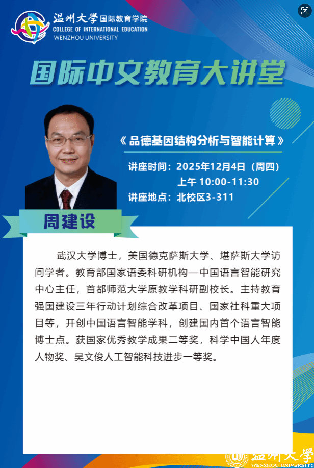 周建设,武汉大学博士,美国德克萨斯大学、堪萨斯大学访问学者。教育部国家语委科研机构—中国语言智能研究中心主任,首都师范大学原教学科研副校长。主持教育强国建设三年行动计划综合改革项目、国家社科重大项目等,开创中国语言智能学科,创建国内首个语言智能博士点。获国家优秀教学成果二等奖,科学中国人年度人物奖、吴文俊人工智能科技进步一等奖。