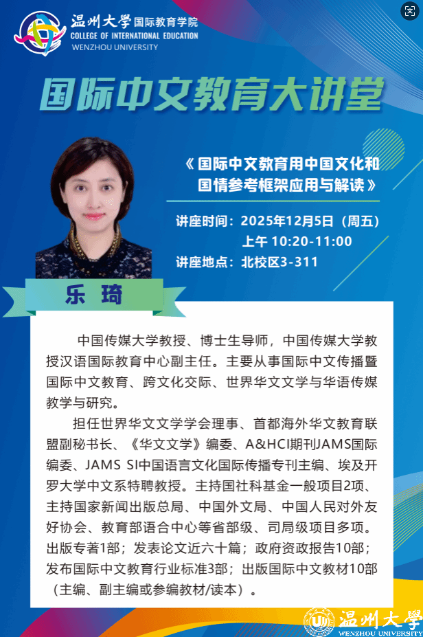 乐琦,中国传媒大学教授、博士生导师,中国传媒大学教授汉语国际教育中心副主任。主要从事国际中文传播暨国际中文教育、跨文化交际、世界华文文学与华语传媒教学与研究。担任世界华文文学学会理事、首都海外华文教育联盟副秘书长、《华文文学》编委、A&HCI期刊JAMS国际编委、JAMS SI中国语言文化国际传播专刊主编、埃及开罗大学中文系特聘教授。主持国社科基金一般项目2项、主持国家新闻出版总局、中国外文局、中国人民对外友好协会、教育部语合中心等省部级、司局级项目多项。出版专著1部;发表论文近六十篇;政府资政报告10部;发布国际中文教育行业标准3部;出版国际中文教材10部(主编、副主编或参编教材/读本)